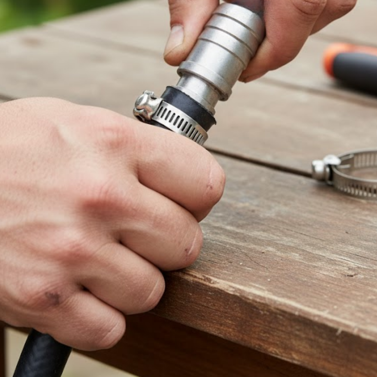 4. Aperto: Aperte as abraçadeiras de forma firme, mas controlada. O aperto deve ser suficiente para comprimir a mangueira contra o alumínio e impedir vazamentos, sem danificar a borracha.