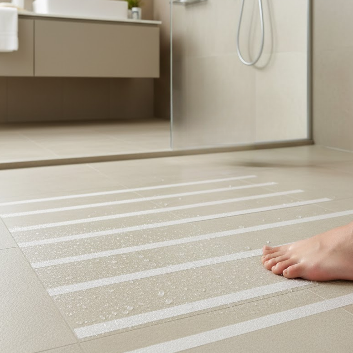 Discrição Total: Por ser 100% transparente, a fita se integra perfeitamente a qualquer tipo de piso e azulejo de banheiro, mantendo o design e a cor original.