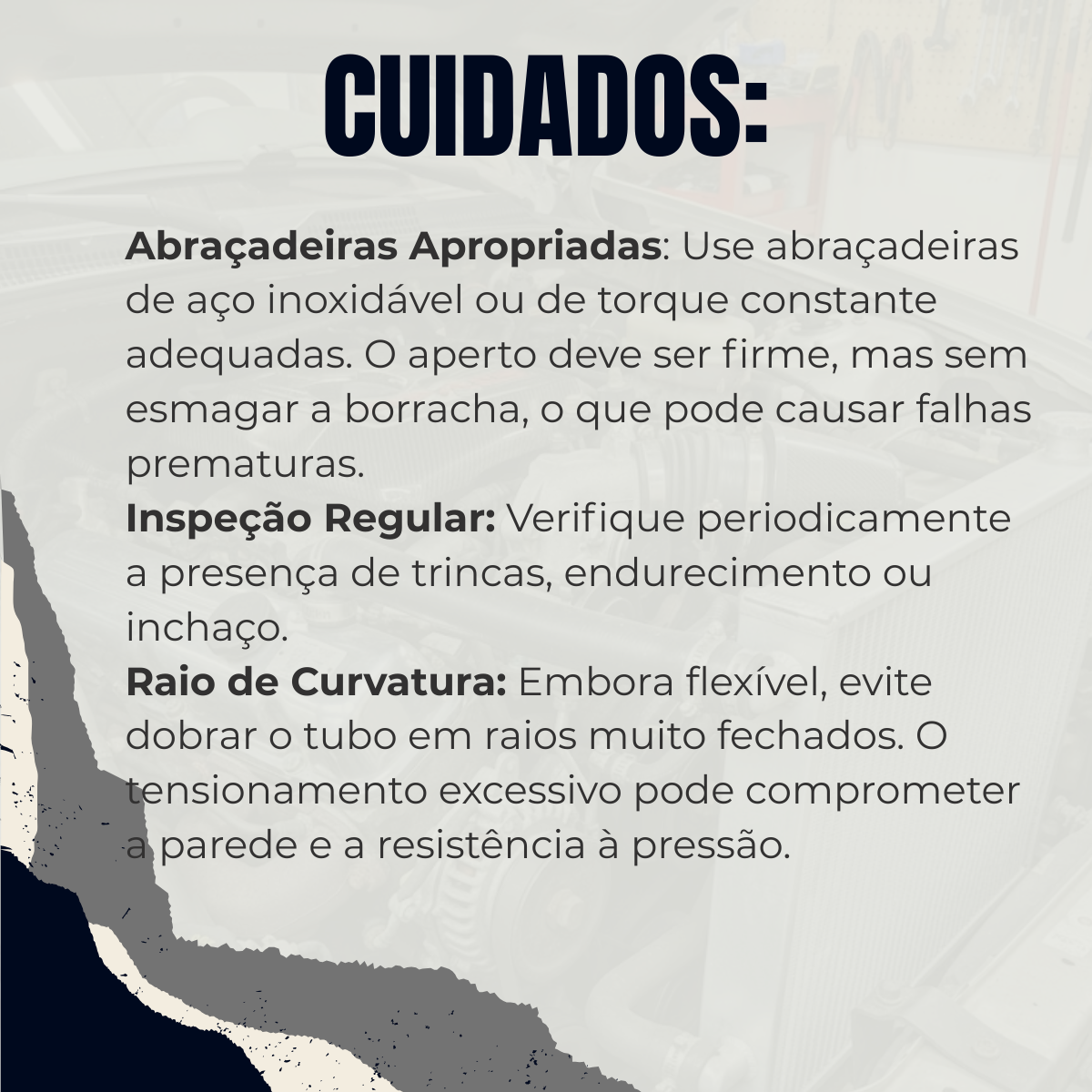 2. Abraçadeiras Apropriadas: Use abraçadeiras de aço inoxidável ou de torque constante adequadas. O aperto deve ser firme, mas sem esmagar a borracha, o que pode causar falhas prematuras.
