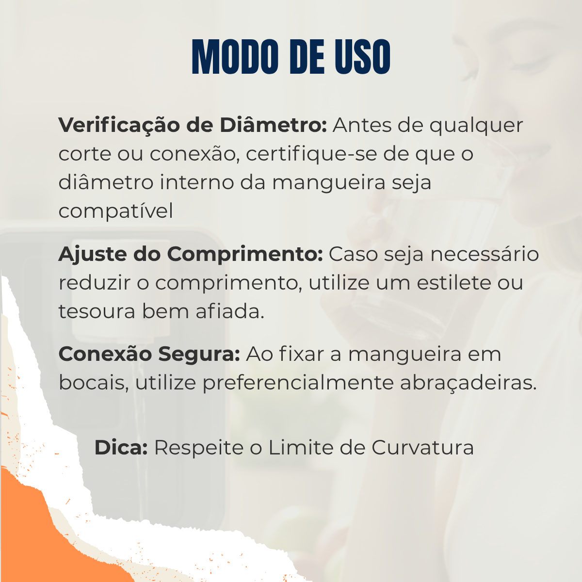 6. Armazenamento: Armazene a mangueira em local fresco e seco, preferencialmente pendurada ou em lances grandes (sem dobras apertadas), longe de fontes de calor excessivo, para manter a integridade da estrutura corrugada.