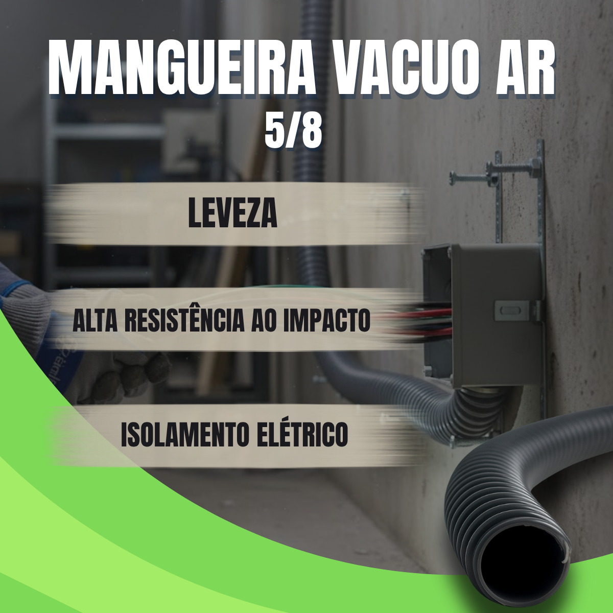 A Mangueira VACUO AR Corrugada é a solução ideal para sistemas que demandam extrema flexibilidade e leveza no transporte de ar, vapores, poeira e materiais leves sob vácuo ou baixa pressão. Sua construção corrugada de alta densidade, geralmente em PVC flexível, oferece uma combinação única de resistência ao amassamento e facilidade de manuseio. Projetada para ser altamente maleável, é a escolha primária em sistemas de ventilação, exaustão, aspiração industrial e residencial, podendo também ser utilizada como conduíte flexível para proteção de cabos elétricos ou hidráulicos.