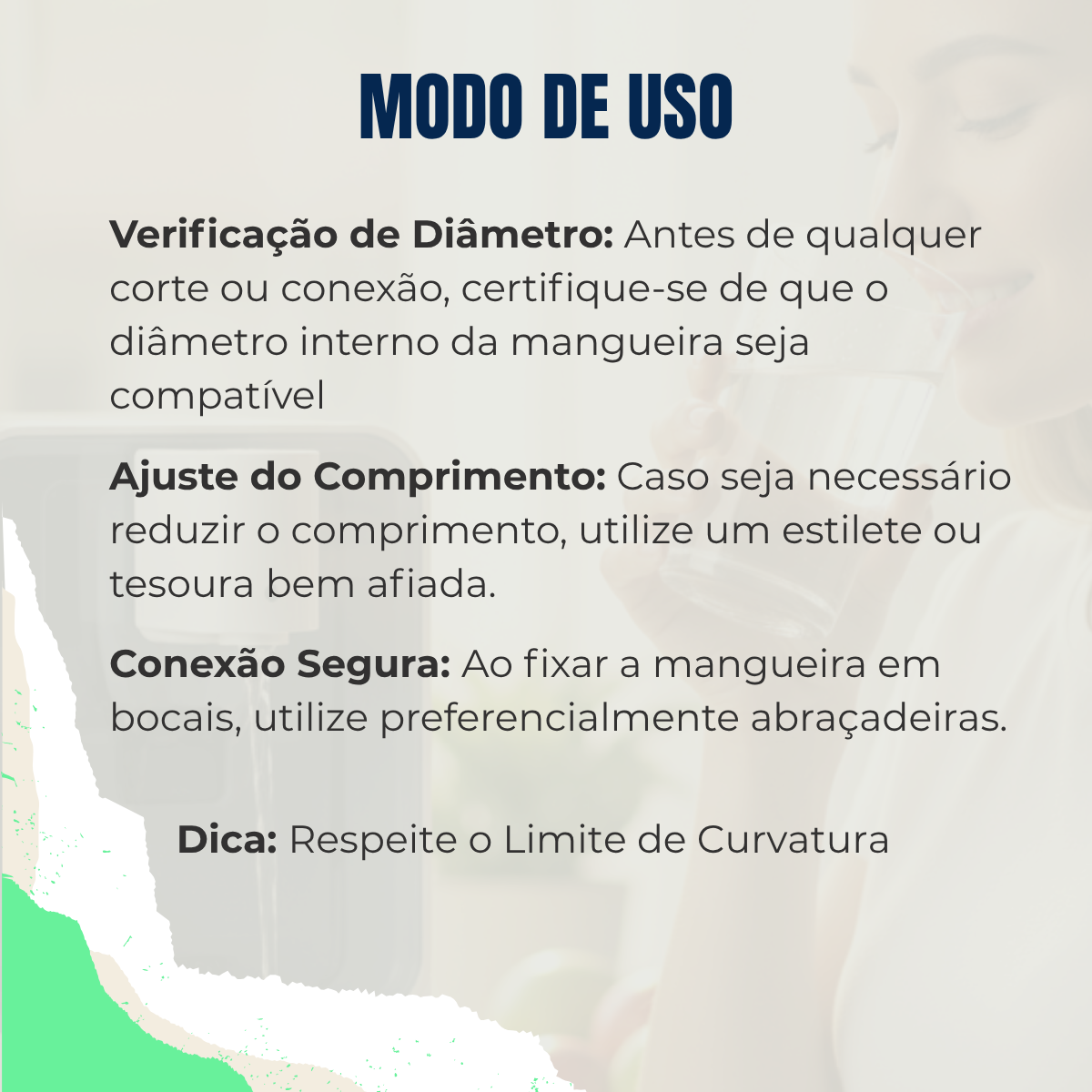 6. Armazenamento: Armazene a mangueira em local fresco e seco, preferencialmente pendurada ou em lances grandes (sem dobras apertadas), longe de fontes de calor excessivo, para manter a integridade da estrutura corrugada.
