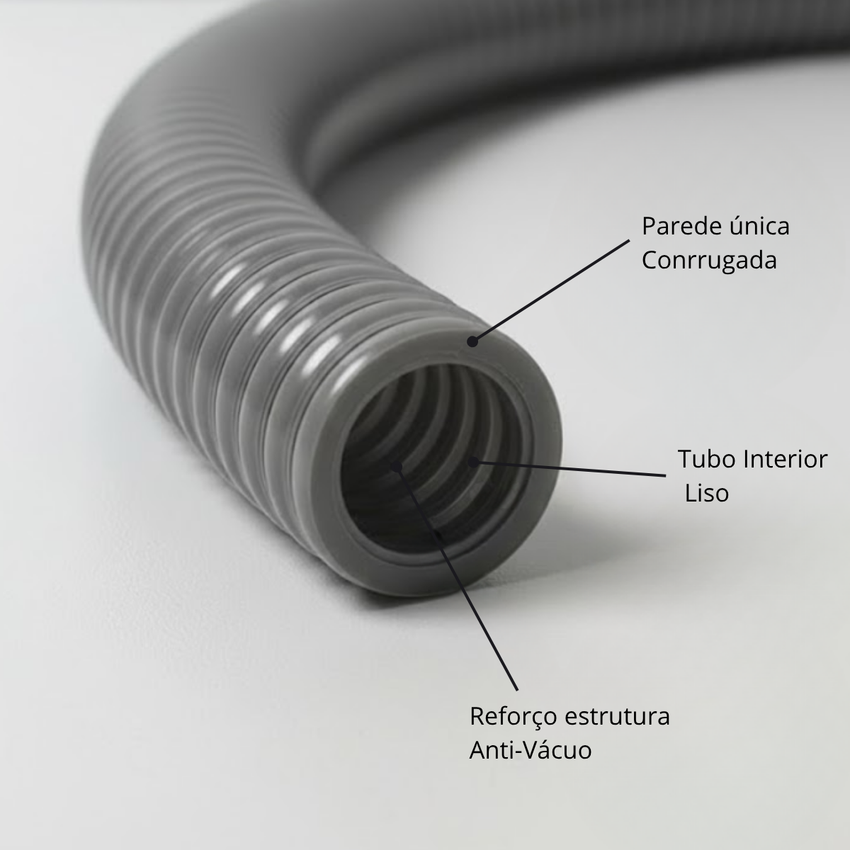 - Resistência ao Colapso (Vácuo): A estrutura corrugada atua como um reforço, mantendo a forma da mangueira mesmo sob sucção intensa, garantindo a eficiência do sistema de vácuo.