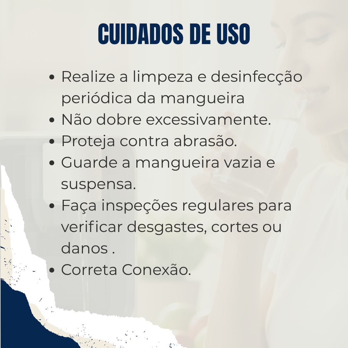 5. Armazenamento: Após o uso, limpe a mangueira, remova toda a água residual e armazene-a enrolada (em lance), em local protegido da luz solar direta (raios UV) e de temperaturas extremas, para preservar a flexibilidade do PVC.