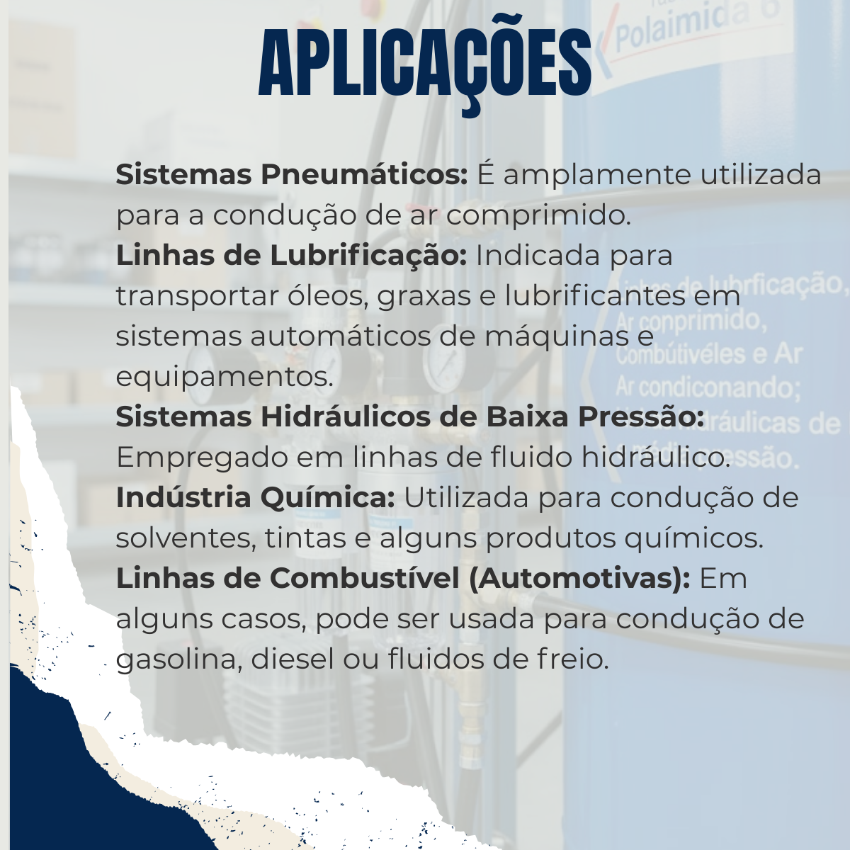 Aplicação Principal: Sistemas pneumáticos e de ar comprimido, linhas de lubrificação, transporte de combustíveis e óleos, painéis de automação, linhas de pintura e refrigeração.