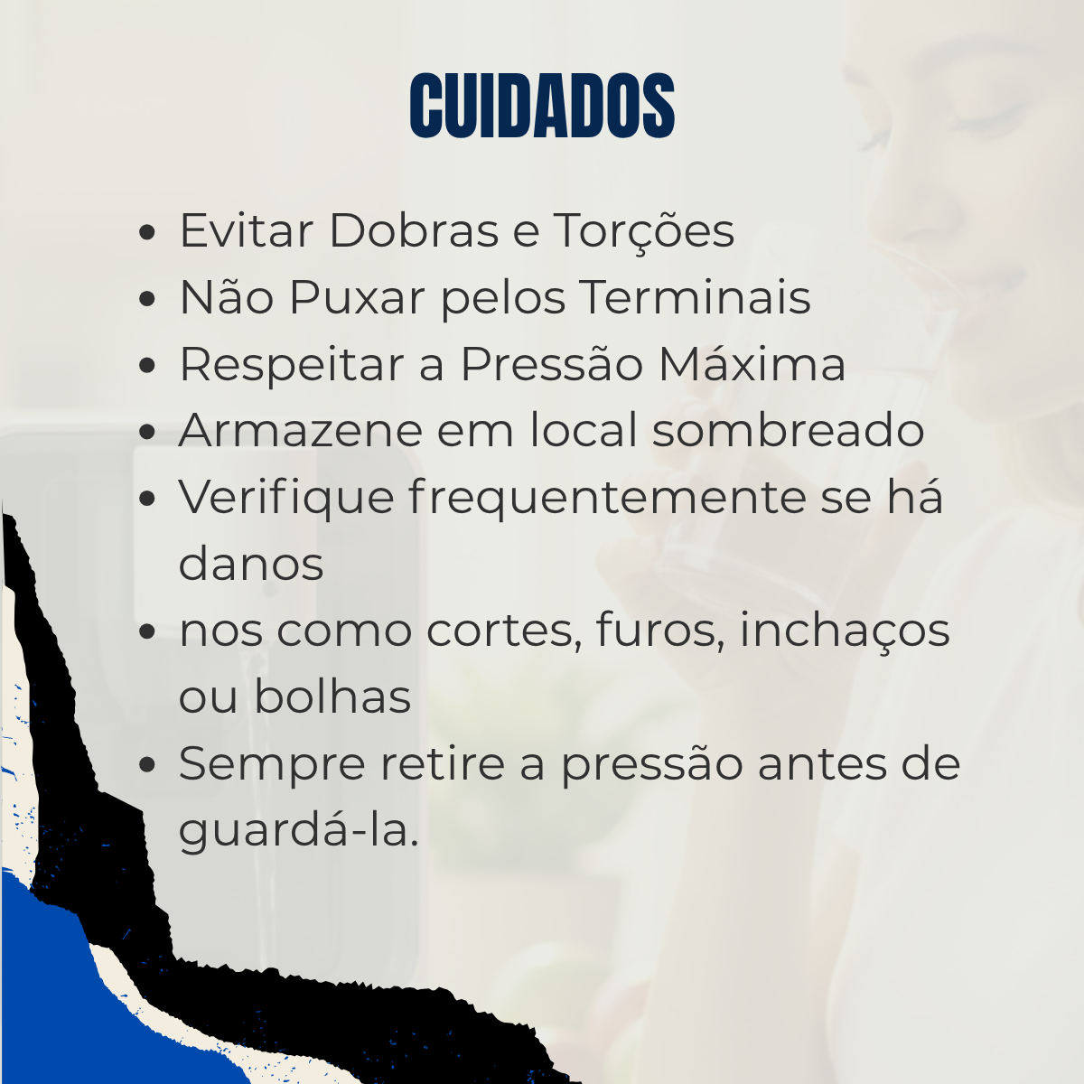 1. Verificação: Antes do uso, inspecione a mangueira para garantir que não haja cortes, rachaduras ou danos visíveis que possam comprometer a pressão ou segurança.