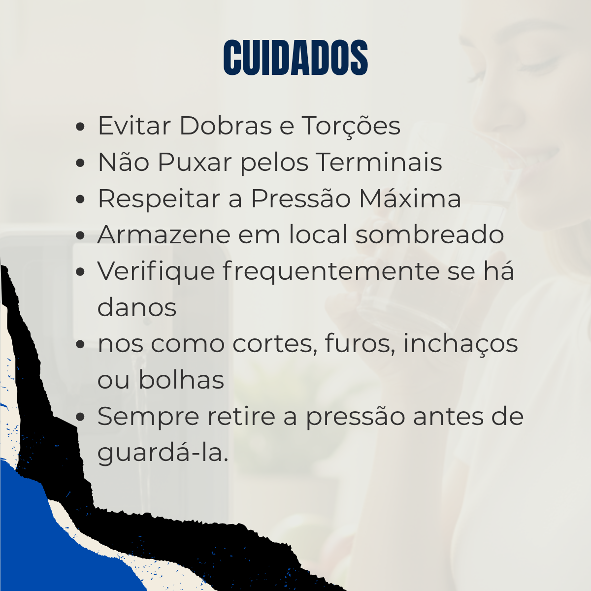 1. Verificação: Antes do uso, inspecione a mangueira para garantir que não haja cortes, rachaduras ou danos visíveis que possam comprometer a pressão ou segurança.