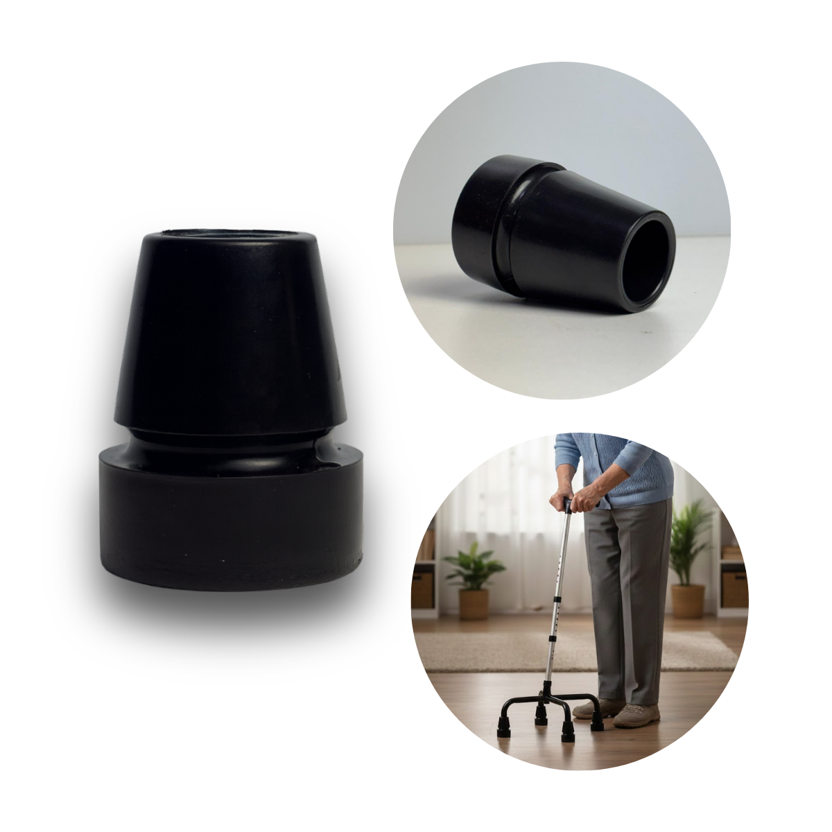 Ponteira de bengala com máxima aderência e durabilidade. Material de borracha reforçada que absorve impacto. Ideal para pisos escorregadios. Compre agora!