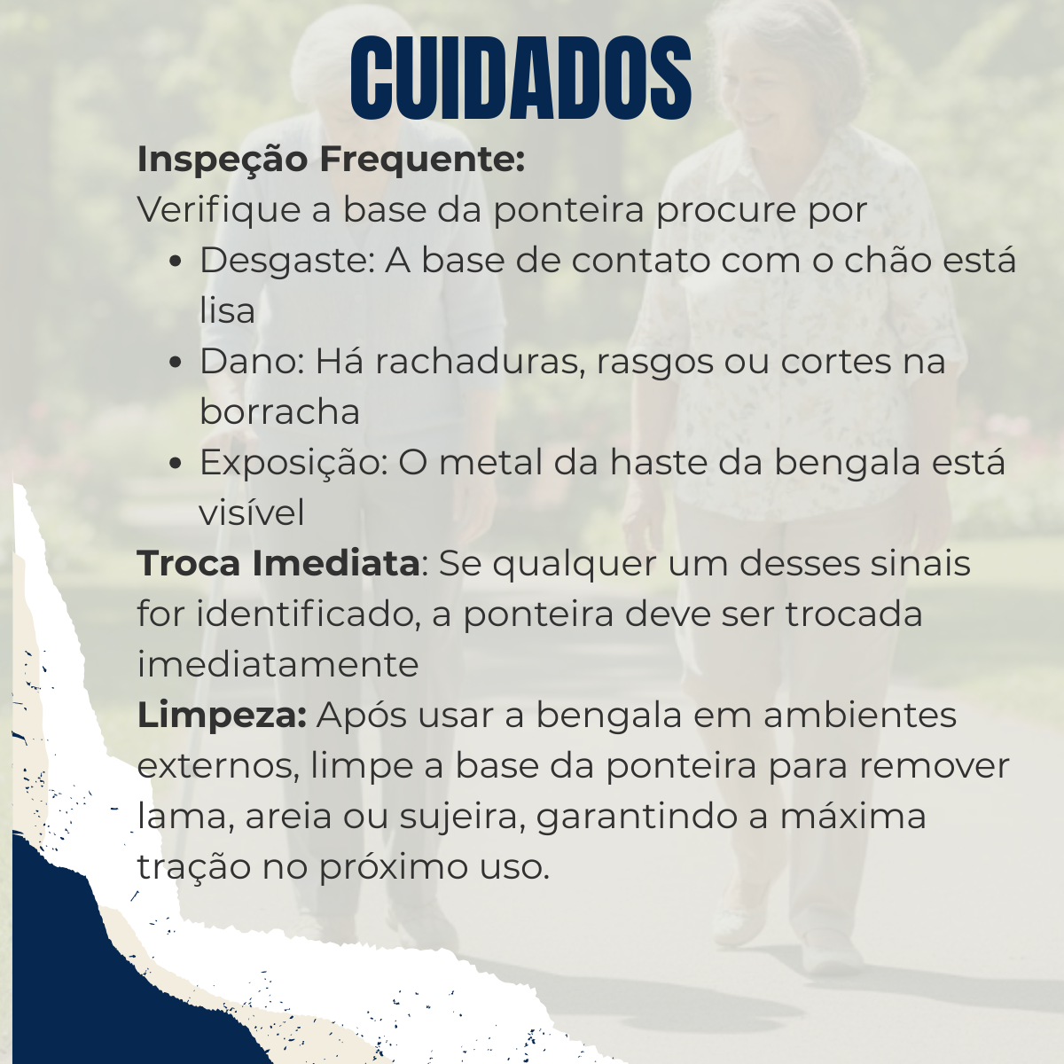 4. Inspeção: Verifique periodicamente se a ponteira não está lisa, rachada ou com o metal da bengala exposto. Substitua a peça imediatamente em caso de qualquer dano para manter a sua segurança.