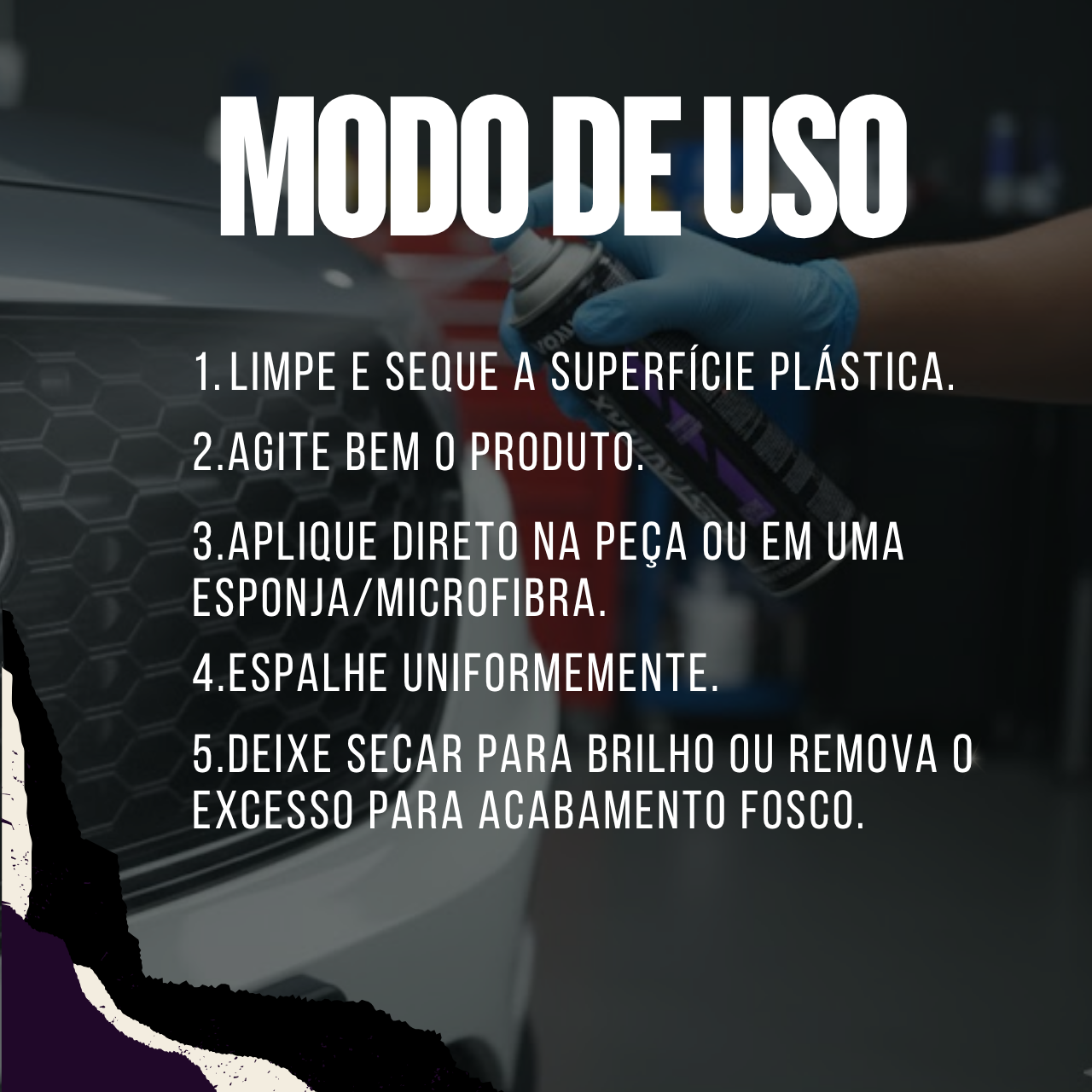 É um restaurador e protetor de superfícies plásticas, com foco em peças externas do veículo, como para-choques, grades, frisos e caixas de rodas.