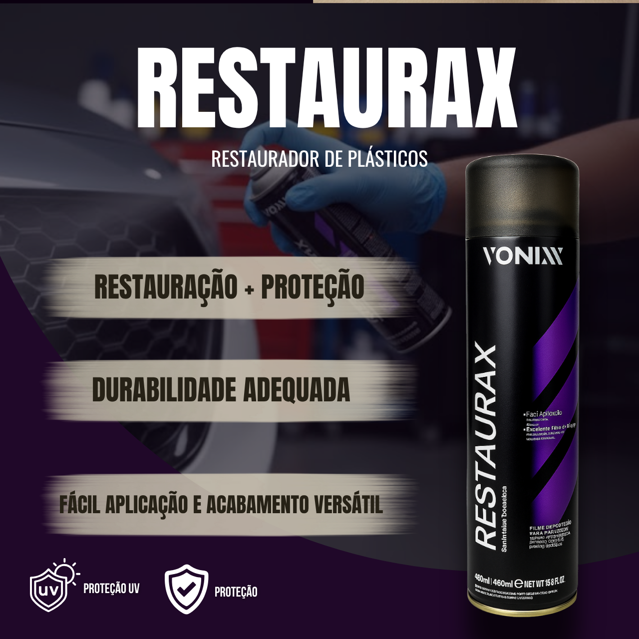 O Vonixx Restaurax Aerossol é uma versão do Restaurax desenvolvida para oferecer mais praticidade e agilidade na aplicação, especialmente em plásticos externos e áreas de difícil acesso.