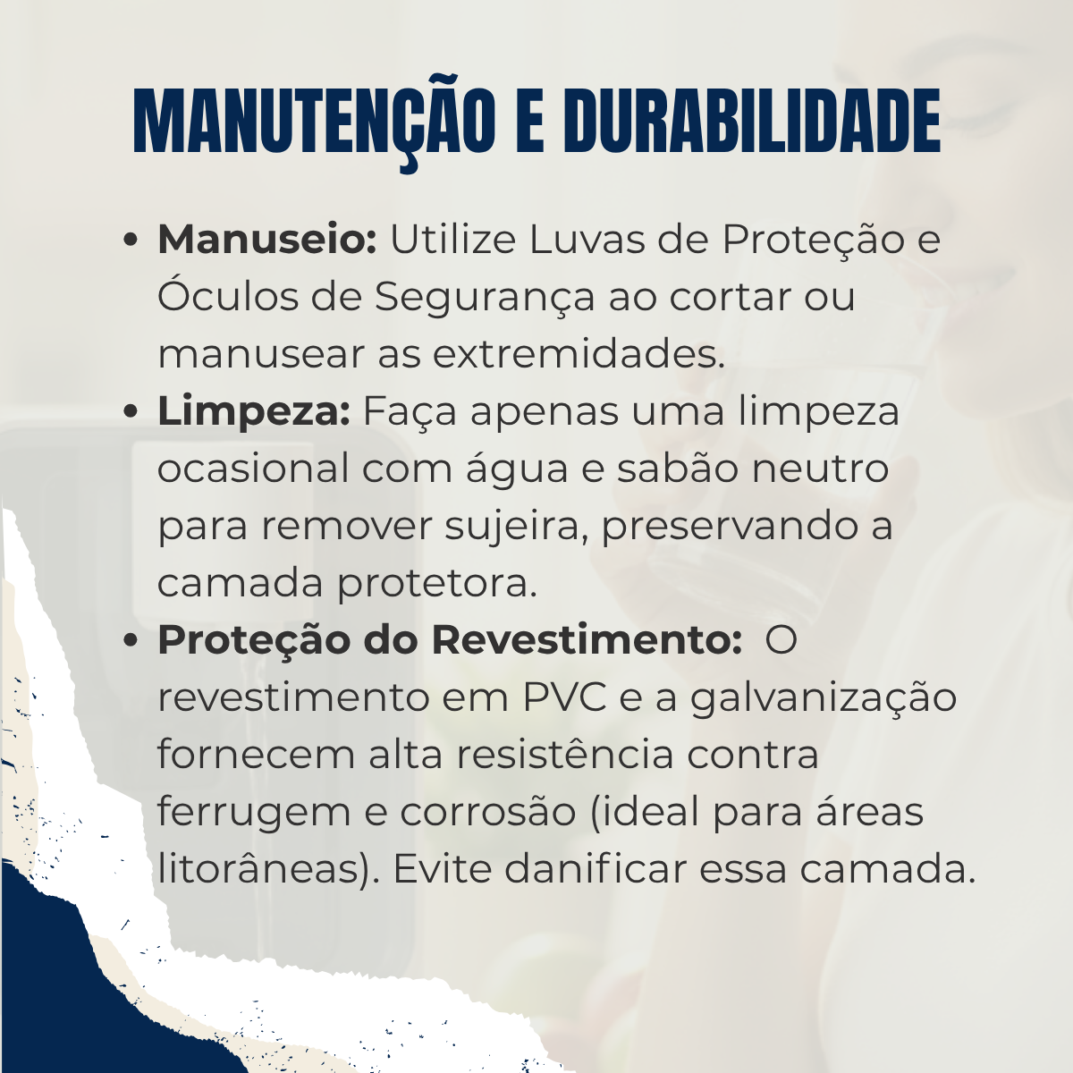1. Segurança no Manuseio: Utilize Equipamentos de Proteção Individual (EPIs), como luvas de raspa e óculos de segurança, ao desenrolar e cortar a tela, devido às extremidades pontiagudas do arame.