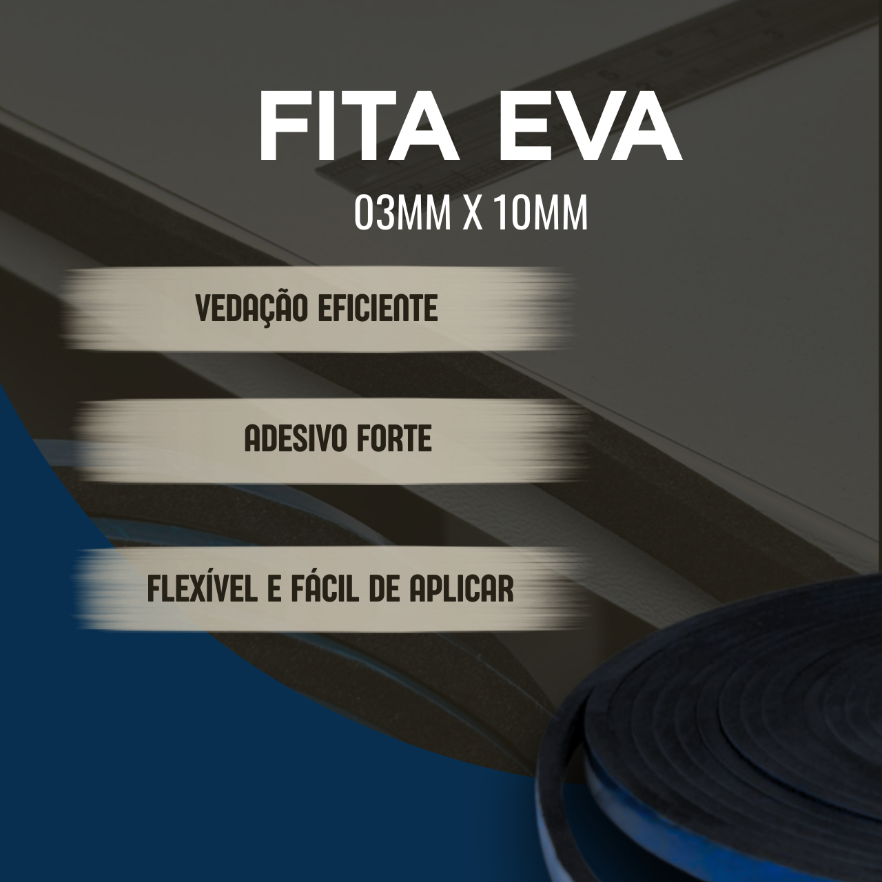 Fita de Borracha EVA de polietileno com adesivo em uma superfície que tornar-se um produto fácil e prático de ser usado sem aplicação de cola e adesivos. Possui boa resistência a intemperes, produtos químicos, impede a passagem do ar, impermeável sob pressão e deformidade. Sua tira de borracha é densa ideal para vedação, redução de vibração e ruídos, Acabamento, Fechar Fresta, Isolamento térmico, Proteção Contra Impacto e Apoio.